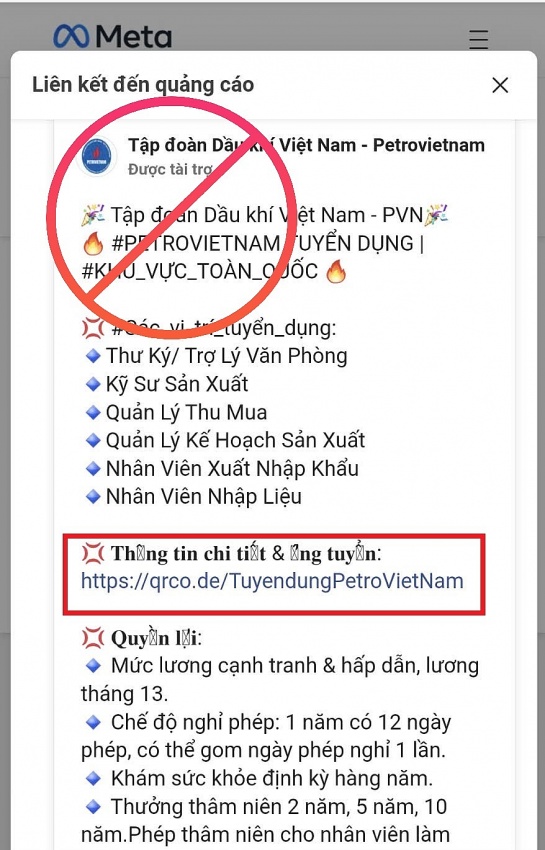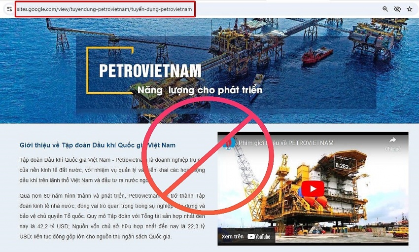 Gần đây trên mạng xã hội tiếp tục xuất hiện một số trang facebook mạo danh Tập đoàn Dầu khí Việt Nam (Petrovietnam), chạy quảng cáo các thông tin tuyển dụng thu hút sự chú ý của nhiều người. Các trang facebook có logo, banner và thông tin tương tự như trang web chính thức của Petrovietnam đăng tải thông tin tuyển dụng hấp dẫn, với mức lương cao và cơ hội thăng tiến tốt. Tuy nhiên, thực chất đây là một chiêu trò lừa đảo khá tinh vi.
