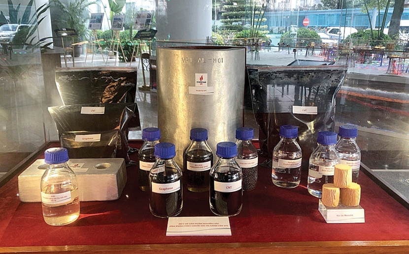 Trong đó, chuỗi giá trị các sản phẩm tiên tiến trên cơ sở vật liệu nanocarbon như: Ống Nano Carbon (CNT), được sản xuất đầu tiên trên thế giới đi từ nguồn nguyên liệu là khí thiên nhiên giàu CO2 (30% CO2) bằng công nghệ lắng đọng pha hơi sử dụng hệ xúc tác kim loại dạng bản mỏng. Sản phẩm CNT có độ tinh thể cao, gồm 2-6 lớp và chiều dài đến 200 µm; Graphene, được sản xuất từ CNT trên cơ sở mở ống bằng phương pháp oxy hóa khử và nhóm chức hóa có kiểm soát để có thể phù hợp cho các ứng dụng khác nhau.