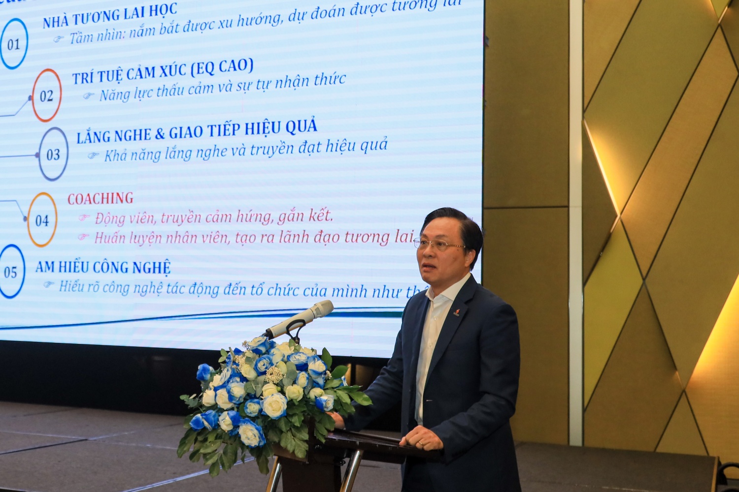 Ông Bùi Minh Tiến - Thành viên HĐTV Petrovietnam trình bày tham luận “Coaching - công cụ hữu hiệu để phát triển nhân viên và xây dựng văn hóa hiệu quả tại doanh nghiệp”.