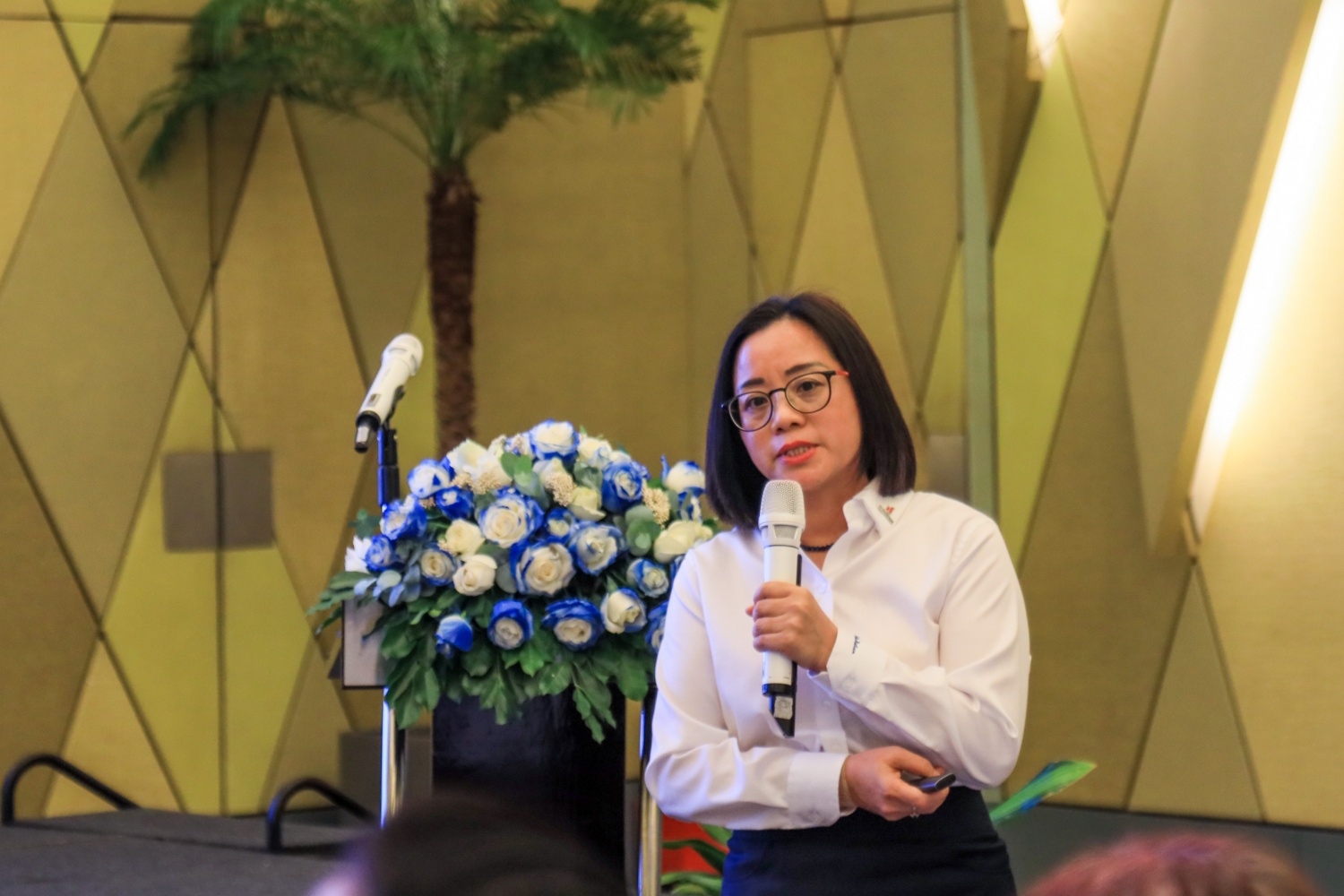 Bà Lê Thị Lam Trà - Phó Trưởng ban Quản trị Nguồn nhân lực Petrovietnam trình bày tham luận về “Xu hướng đào tạo phát triển trong bối cảnh chuyển dịch năng lượng quốc tế và những đề xuất đối với công tác phát triển nguồn nhân lực của Petrovietnam”.