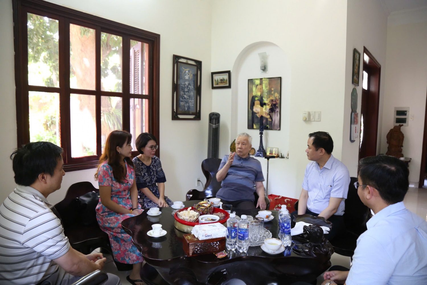 Đồng chí Lê Xuân Huyên - Phó Tổng Giám đốc phụ trách Ban Điều hành Petrovietnam cùng đồng chí Nguyễn Mạnh Kha, Chủ tịch Công đoàn Petrovietnam, trò chuyện với gia đình Trung tướng Nguyễn Hòa, cố Tổng cục trưởng Tổng cục Dầu khí.