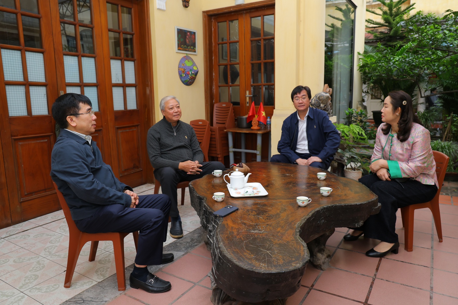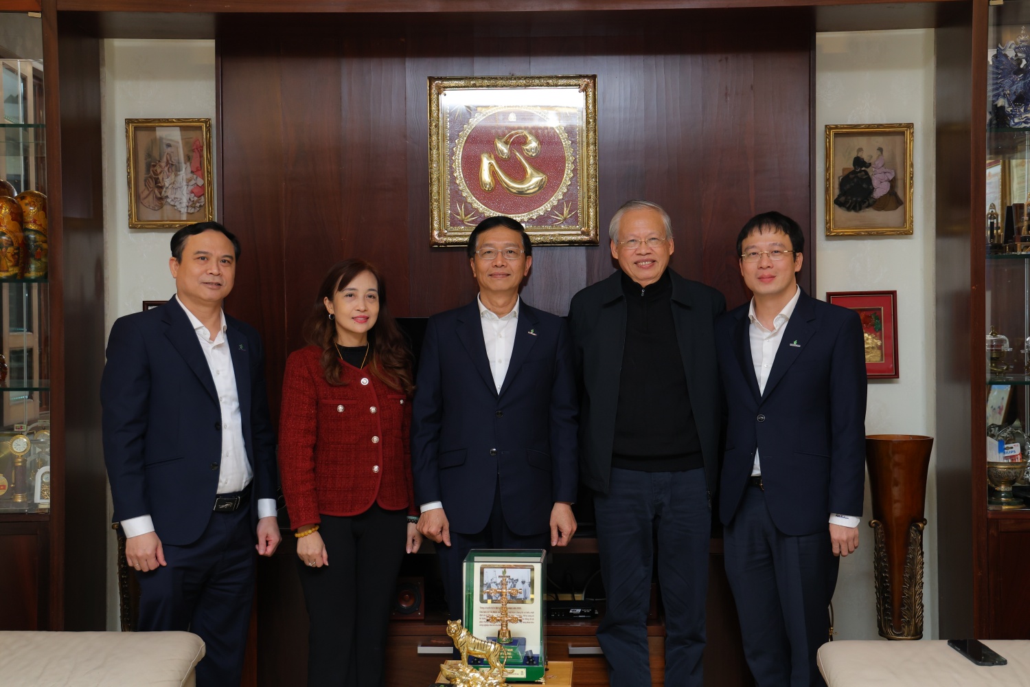Đồng chí Lê Xuân Huyên - Phó Tổng Giám đốc phụ trách Ban Điều hành Petrovietnam cùng đồng chí Nguyễn Mạnh Kha, Chủ tịch Công đoàn Petrovietnam, trò chuyện với đồng chí Phan Đình Đức, nguyên Thành viên HĐTV Petrovietnam (con trai Thượng tướng Đinh Đức Thiện).