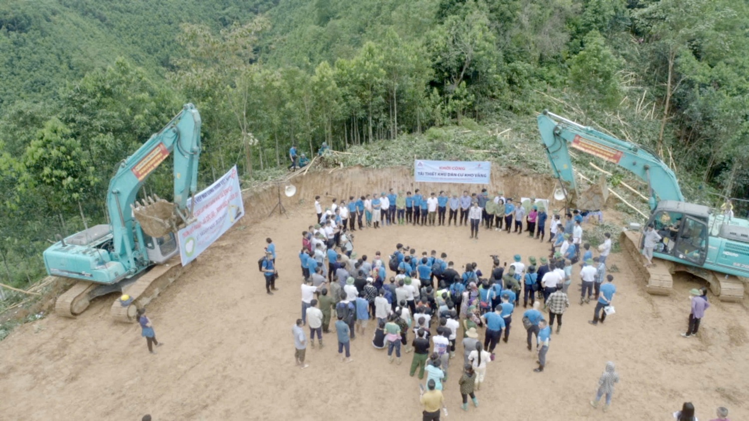Máy xúc thực hiện khởi công tái thiết khu dân cư thôn Kho Vàng. Dự kiến, khu dân cư thôn Kho Vàng sẽ hoàn thành sớm trước ngày 31/12/2024 để bà con nhân dân sớm được đón Tết trong ngôi nhà mới.