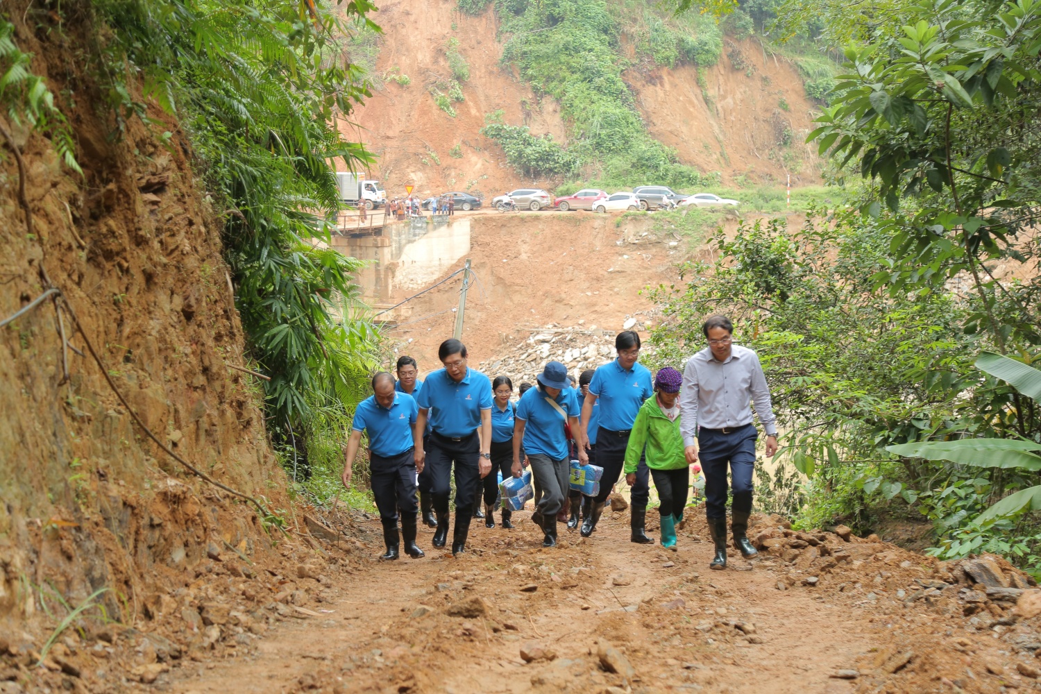 Để đảm bảo an toàn cho khu vực dân cư mới, địa phương đã khảo sát và quyết định chọn khu vực tái định cư mới của thôn cách vị trí thôn cũ khoảng gần 1,5km. Trong ảnh, đoàn công tác của Petrovietnam di chuyển lên một đoạn dốc dài hơn 500m để đến khu vực khởi công.