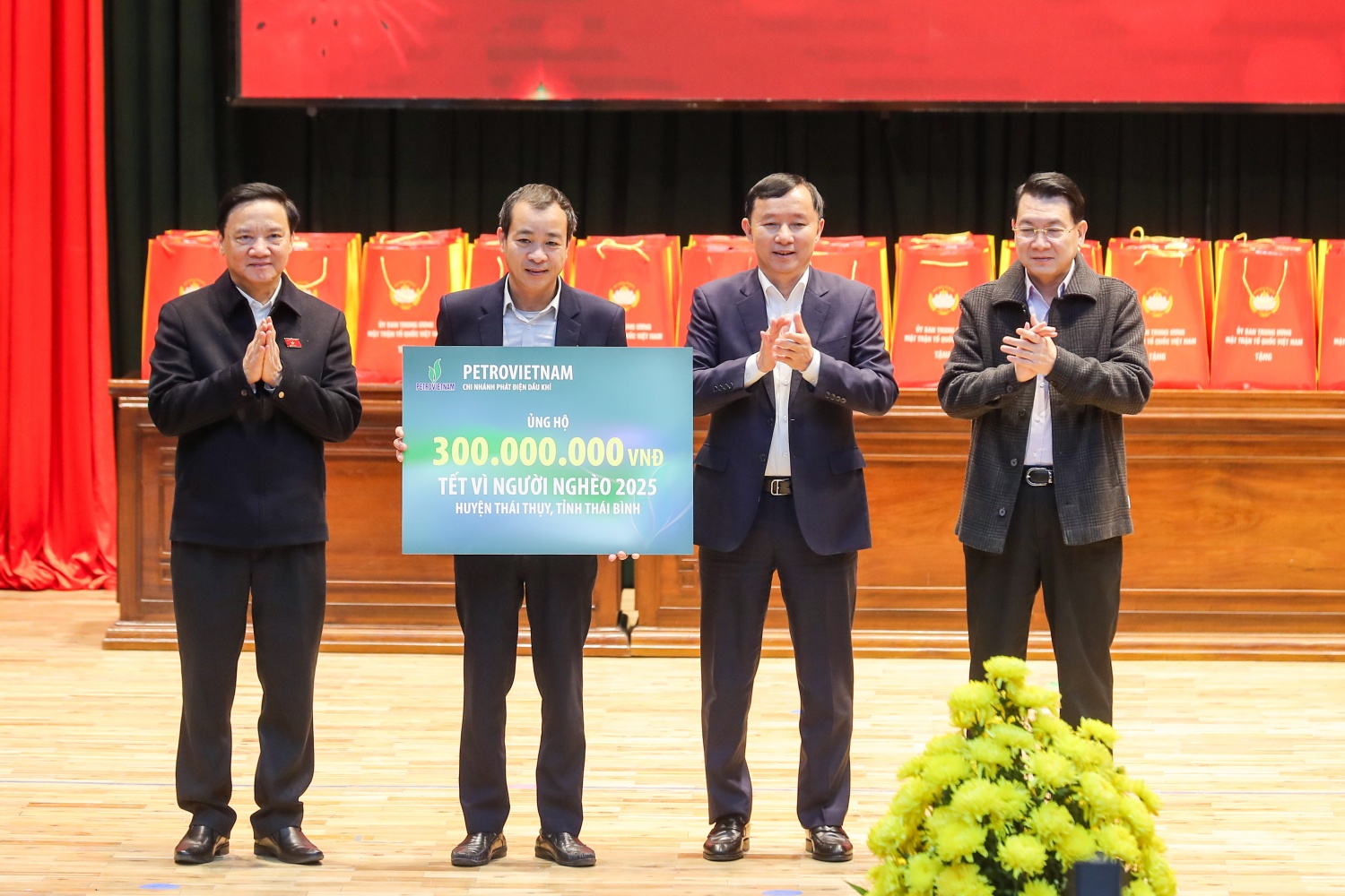Trong dịp trao quà Tết năm nay, Petrovietnam đã trao tặng bà con huyện Thái Thụy 300 triệu đồng và trao tặng tỉnh Thái Bình 500 triệu đồng để gửi tới những hộ gia đình khó khăn ở các huyện khác trên địa bàn tỉnh. Ngoài ra, Tổng Công ty Phân bón và Hóa chất Dầu khí (PVFCCo) cũng hỗ trợ cho huyện Vũ Thư 300 triệu đồng.
