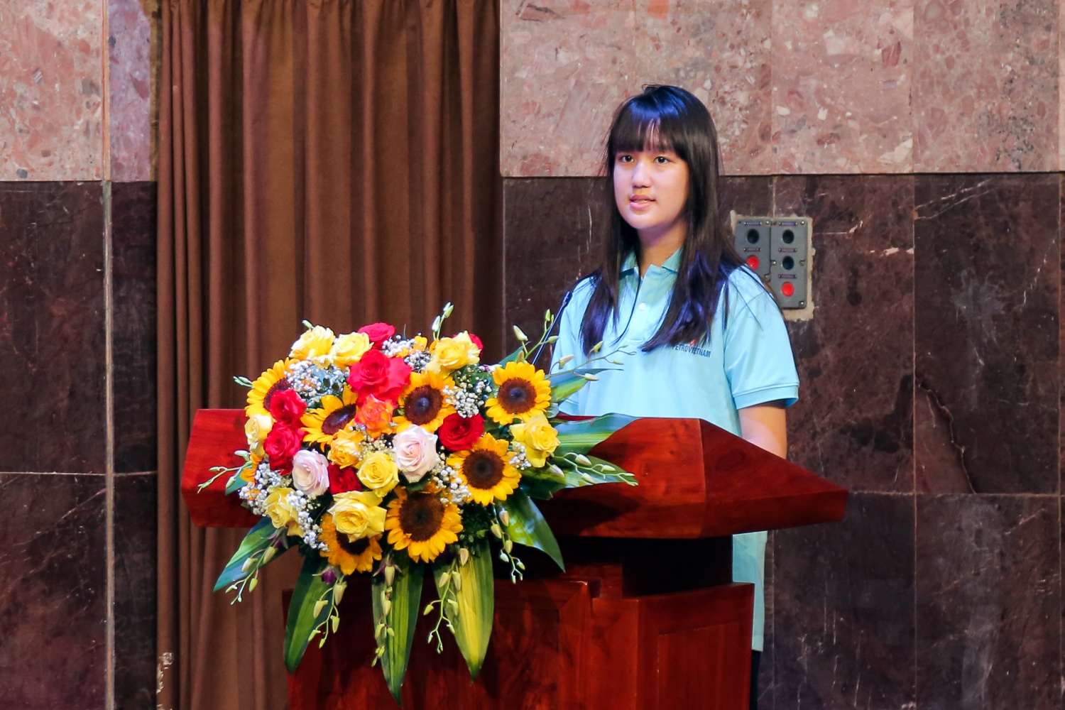 Em Tô Khánh An, học sinh lớp 8C trường Trung học Hà Nội – Amsterdam, đại diện cho các em học sinh đạt thành tích cao phát biểu tại buổi lễ