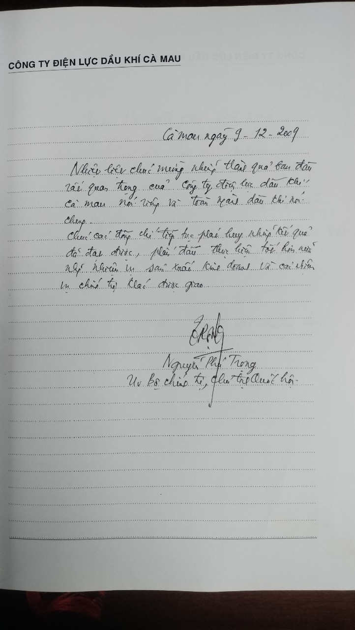 “Nhiệt liệt chúc mừng những thành quả ban đầu rất quan trọng của Công ty Điện lực Dầu khí Cà Mau nói riêng và toàn ngành Dầu khí nói chung. Chúc các đồng chí tiếp tục phát huy những kết quả đã đạt được, phấn đấu thực hiện tốt hơn nữa những nhiệm vụ sản xuất kinh doanh và các nhiệm vụ chính trị khác được giao.” – đồng chí Nguyễn Phú Trọng ghi trong sổ lưu niệm.