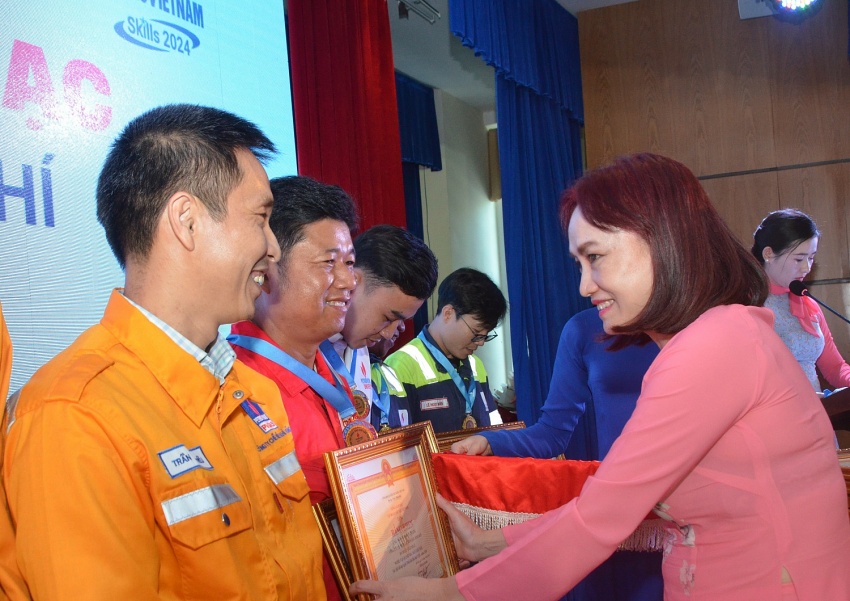 Bà Nghiêm Thùy Lan trao giải toàn đoàn cho các đơn vị tại Hội thi tay nghề Dầu khí lần VIII.