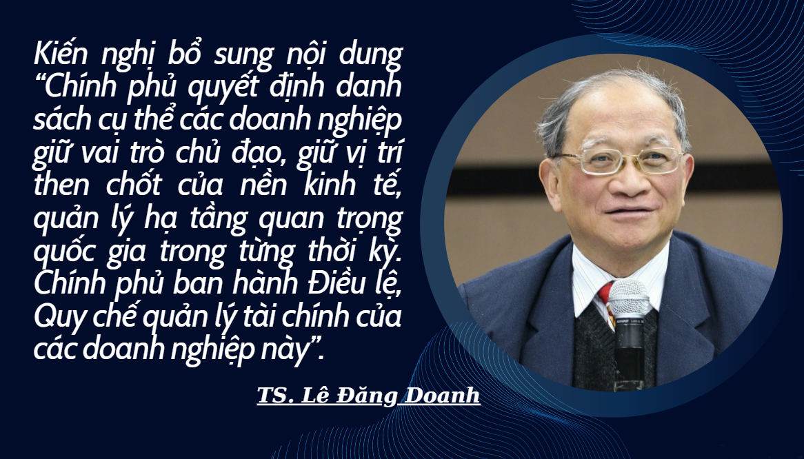 Thứ nhất, kiến nghị bổ sung nội dung “Chính phủ quyết định danh sách cụ thể các doanh nghiệp giữ vai trò chủ đạo, giữ vị trí then chốt của nền kinh tế, quản lý hạ tầng quan trọng quốc gia trong từng thời kỳ. Chính phủ ban hành Điều lệ, Quy chế quản lý tài chính của các doanh nghiệp này”.