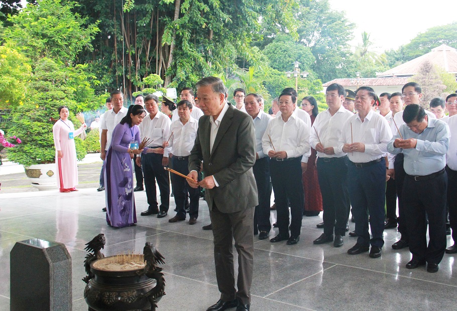 Vào đầu giờ sáng, Tổng Bí thư Tô Lâm cùng đoàn công tác đã đến viếng, dâng hương, dâng hoa Cụ Phó bảng Nguyễn Sinh Sắc - Thân sinh Chủ tịch Hồ Chí Minh tại Khu di tích Nguyễn Sinh Sắc, thành phố Cao Lãnh; viết sổ lưu niệm và trồng cây lưu niệm tại Khu di tích.
