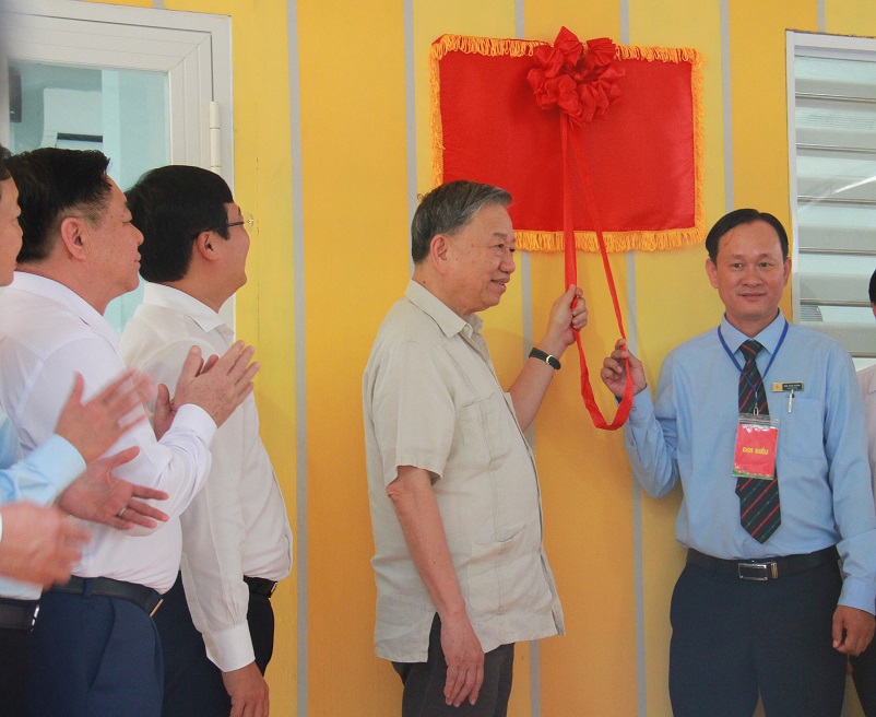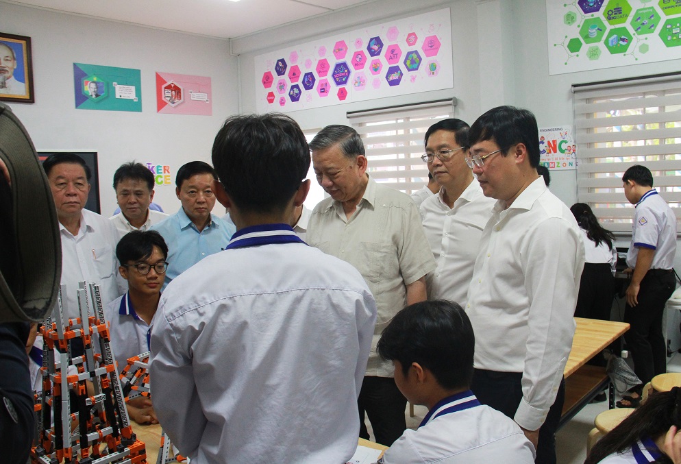 Tổng Bí thư và các đại biểu thăm và trao tặng phòng thực hành giáo dục STEM cho Trường THPT Tràm Chim