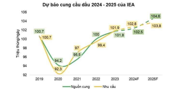 Về nguồn cung dầu thô, năm 2024, dự báo nguồn cung dầu toàn cầu sẽ đạt mức 101,8 triệu thùng/ngày. Trong đó, sản lượng dầu từ các nước bên ngoài OPEC+ có thể tăng thêm 1,5 triệu thùng/ngày. Tuy nhiên, sang năm 2025 thì nguồn cung dầu được dự báo có thể tăng thêm 2,1 triệu thùng/ngày bởi nhóm OPEC+ có thể tiến hành nới lỏng sản lượng cắt giảm. Điều này có thể khiến cho thị trường ở trạng thái dư cung trong năm 2025.