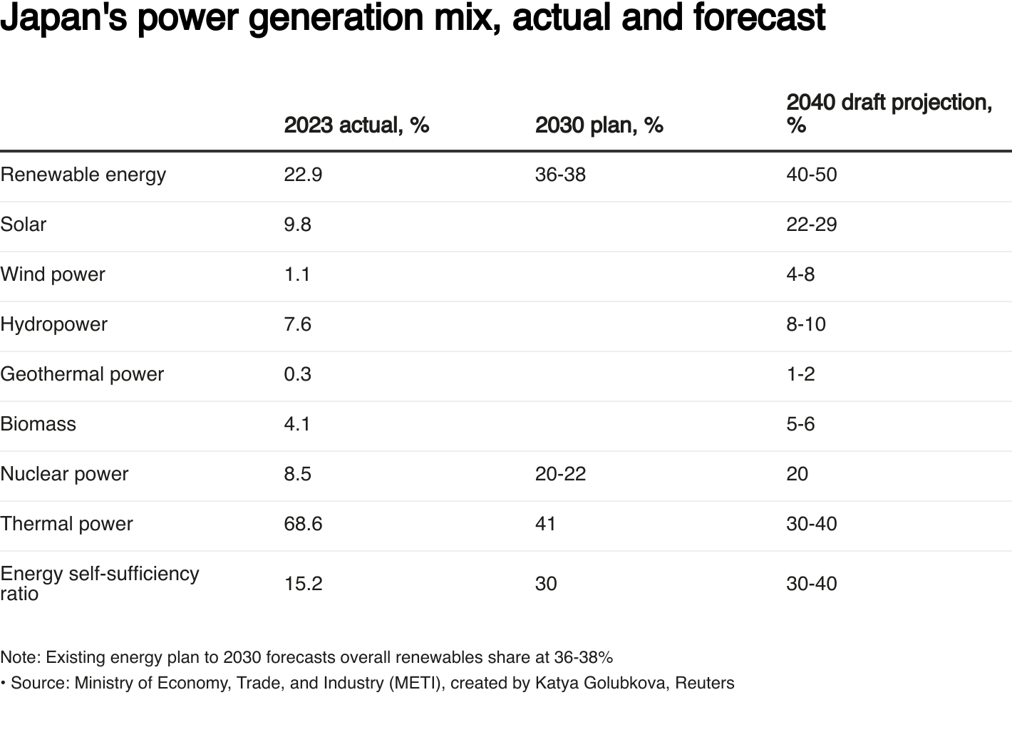 Bộ Công nghiệp Nhật Bản đề xuất nâng tỷ lệ năng lượng tái tạo lên mức 40-50% vào năm tài chính 2040, gần gấp đôi mức 22,9% của năm 2023 và vượt qua mục tiêu 36-38% của năm 2030.
