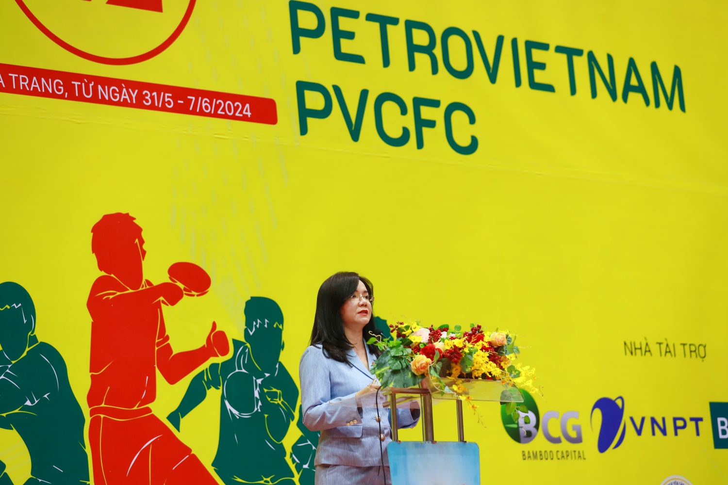 Bà Nguyễn Thị Hiền - Phó Tổng Giám đốc PVCFC phát biểu tại Lễ Khai mạc Giải vô địch bóng bàn quốc gia Báo Nhân Dân lần thứ 42.