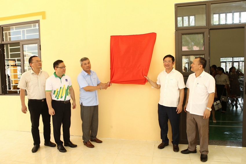 Đại diện PVFCCo trao biểu trưng tài trợ xây dựng Nhà đa năng, cải tạo các dãy phòng học và khuôn viên Trường THCS thị trấn Nưa.