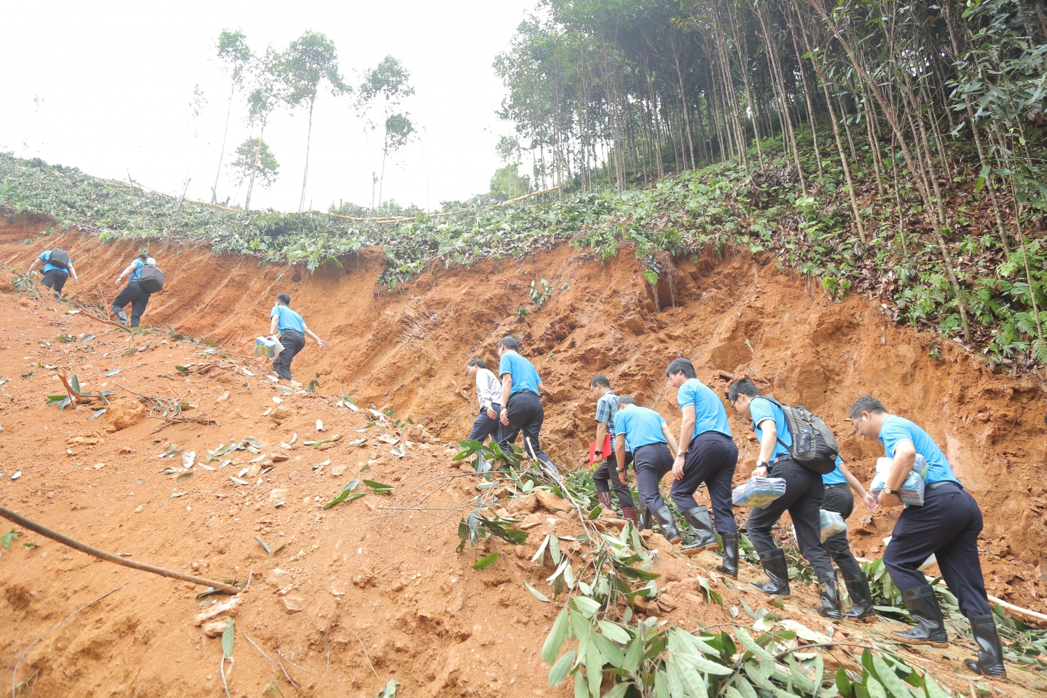 Để đảm bảo an toàn cho khu vực dân cư mới, địa phương đã khảo sát và quyết định chọn khu vực tái định cư mới của thôn cách vị trí thôn cũ khoảng gần 1,5km. Trong ảnh, đoàn công tác của Petrovietnam di chuyển lên một đoạn dốc dài hơn 500m để đến khu vực khởi công.