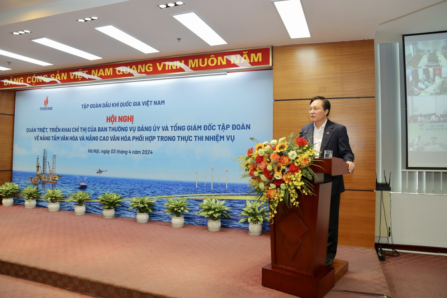 Hội nghị đã nghe đồng chí Trần Quang Dũng, Ủy viên Ban Thường vụ Đảng ủy, Trưởng Ban Tuyên giáo Đảng ủy, Trưởng Ban Truyền thông và Văn hóa doanh nghiệp Petrovietnam truyền đạt nội dung hai chỉ thị của Ban Thường vụ Đảng ủy Tập đoàn và Tổng Giám đốc Tập đoàn. Trong đó, Ban Thường vụ Đảng ủy Tập đoàn yêu cầu các cấp ủy, tổ chức đảng, đoàn thể trực thuộc Tập đoàn và các cán bộ quản lý tại các đơn vị triển khai nghiêm túc 04 nội dung chính gồm: Đẩy mạnh tuyên truyền, giáo dục, thống nhất nhận thức từ người đứng đầu đến từng cán bộ, đảng viên, người lao động về các giá trị, tài sản văn hóa của Tập đoàn, đơn vị; Triển khai xây dựng văn hóa doanh nghiệp là nhiệm vụ trọng tâm của cả hệ thống chính trị, đảm bảo tính hệ thống, đồng bộ, liên tục, hướng đích theo “Quy trình triển khai văn hóa doanh nghiệp tại đơn vị”; Xây dựng Cơ sở dữ liệu tri thức ngành Dầu khí; Hoàn thiện, cập nhật hệ thống văn bản, quy chế, quy trình, quy định nội bộ, chú trọng phổ biến, áp dụng thực hiện, nhất là cấp cơ sở và tới từng cán bộ, đảng viên, người lao động làm căn cứ thực thi văn hóa, phát triển doanh nghiệp.