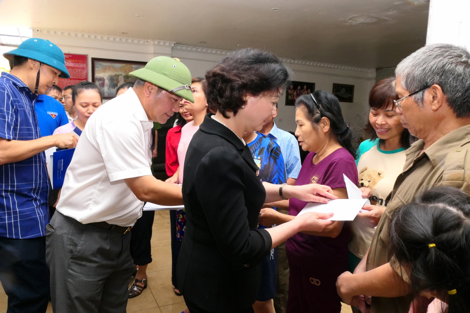 Đồng chí Phạm Thị Thanh Trà và đồng chí Đỗ Chí Thanh tặng quà, chia sẻ khó khăn với các hộ gia đình bị thiệt hại tại phường Đồng Tâm.