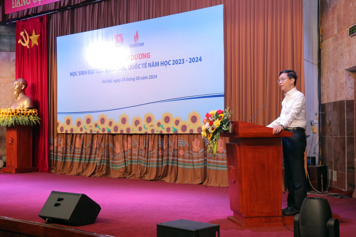 Thay mặt lãnh đạo Tập đoàn, đồng chí Trần Quang Dũng, Phó Bí thư thường trực Đảng ủy Tập đoàn chúc mừng các em học sinh đạt thành tích cao trong các kỳ thi quốc gia và quốc tế năm học 2023-2024. Nhân dịp này, đồng chí Trần Quang Dũng đã chia sẻ với các em học sinh về lịch sử hình thành, xây dựng và phát triển ngành Dầu khí và Tập đoàn Dầu khí Việt Nam bắt đầu tư ý nguyện của Chủ tịch Hồ Chí Minh đúng 65 năm trước. Đồng chí Trần Quang Dũng mong rằng các em học sinh là con em của các phụ huynh trong ngành Dầu khí sẽ tiếp tục cố gắng, nỗ lực, bồi đắp, rèn luyện ý chí, khát vọng cho bản thân, phát huy "bộ gen của người Dầu khí" để tiếp tục cống hiến xây dựng đất nước, có ích cho xã hội, chung tay phát triển ngành Dầu khí và Tập đoàn Dầu khí Việt Nam trong tương lai.