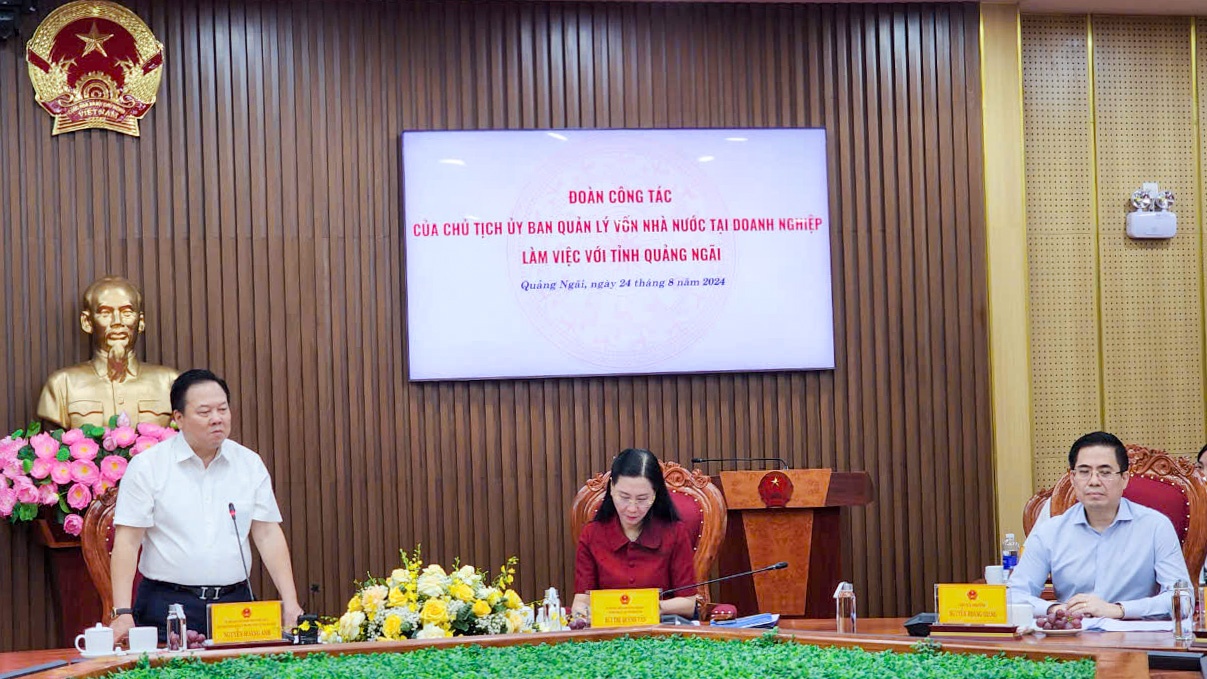 Ngày 24/8, Chủ tịch Ủy ban Quản lý vốn Nhà nước tại doanh nghiệp (UBQLVNN) Nguyễn Hoàng Anh dẫn đầu đoàn công tác đã đến làm việc tại tỉnh Quảng Ngãi về tình hình phát triển công nghiệp, thương mại 7 tháng đầu năm 2024 và thu hút đầu, hoạt động của các tập đoàn, tổng công ty trên địa bàn tỉnh. Tại đây, đại diện tỉnh Quảng Ngãi đã có những đánh giá về tiềm năng phát triển trong lĩnh vực công nghiệp của tỉnh.