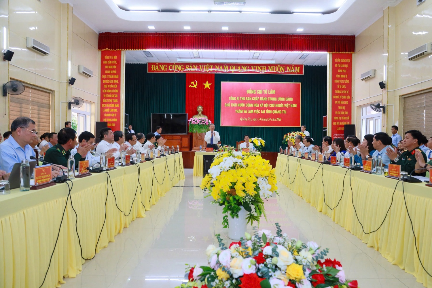 Phát biểu tại buổi làm việc, Tổng Bí thư, Chủ tịch nước Tô Lâm đánh giá cao những thành quả kinh tế - xã hội mà Đảng bộ, chính quyền, doanh nghiệp và nhân dân Quảng Trị đã đạt được trong thời gian qua. Đảng bộ, chính quyền và nhân dân tỉnh Quảng Trị đã đoàn kết, thống nhất, tích cực triển khai Nghị quyết Đại hội XIII của Đảng và Nghị quyết đại hội Đảng bộ tỉnh lần thứ XVII, đã ban hành nhiều nghị quyết chuyên đề, kết luận, chỉ thị, các chương trình hành động, kế hoạch triển khai.