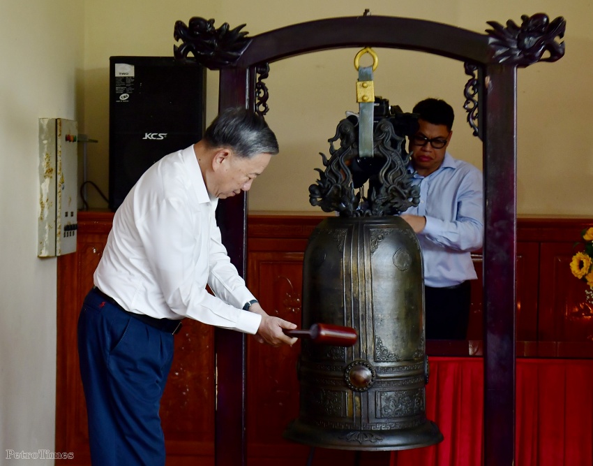 Tổng Bí thư Tô Lâm thực hiện nghi lễ thỉnh chuông tưởng nhớ công ơn Chủ tịch Hồ Chí Minh cho sự nghiệp giải phóng dân tộc, thống nhất đất nước.