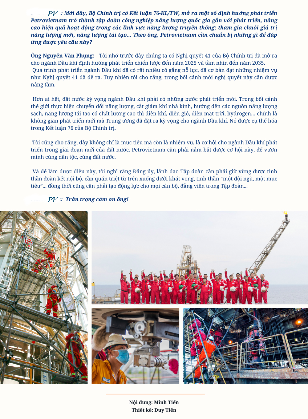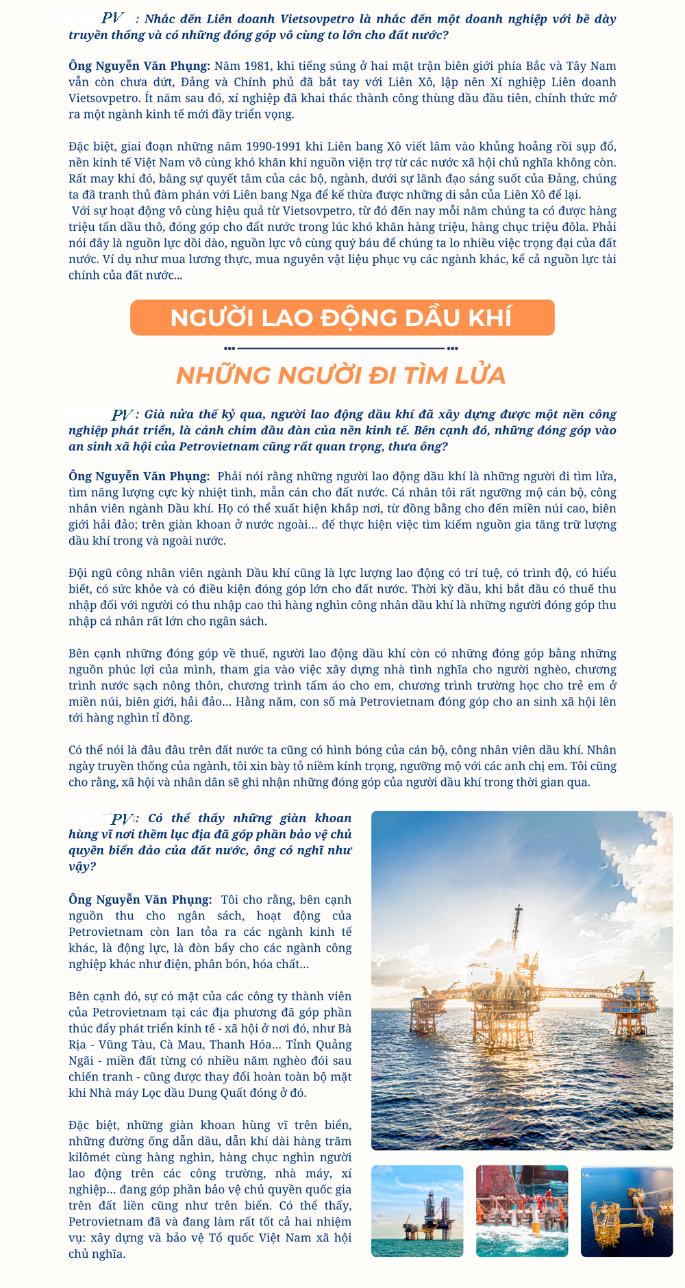 Nhân kỷ niệm 63 năm Ngày Truyền thống của ngành Dầu khí, chúng tôi đã có cuộc trò chuyện hết sức chân tình, cởi mở với ông Nguyễn Văn Phụng, nguyên Cục trưởng Cục Quản lý thuế doanh nghiệp lớn (Tổng cục Thuế) - cũng là người gắn bó sâu sắc với Tập đoàn Dầu khí Việt Nam (Petrovietnam). Ông Phụng cho rằng, Petrovietnam cần nắm bắt vận hội mới, để vươn mình cùng dân tộc ...